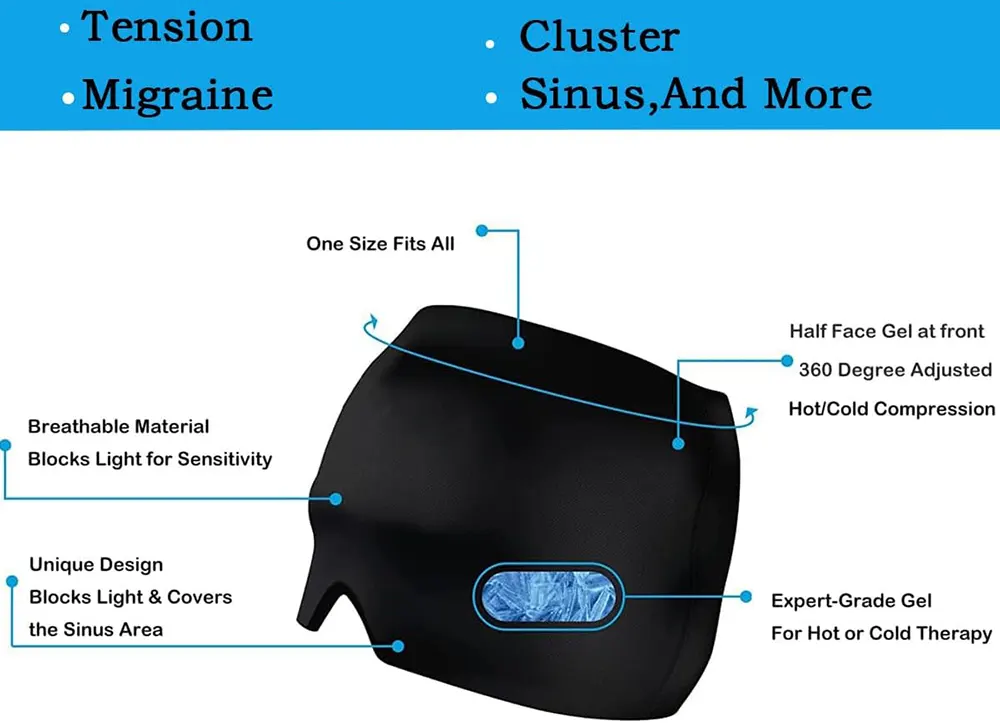 - الطريقة التي يتشكل بها الجل على الرأس توفر ضغطًا باردًا لتخفيف الشد والإجهاد وآلام الجيوب الأنفية وضغط الجيوب الأنفية ببساطة عن طريق ارتداء قبعة تخفيف الصداع