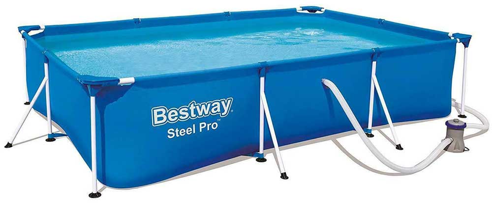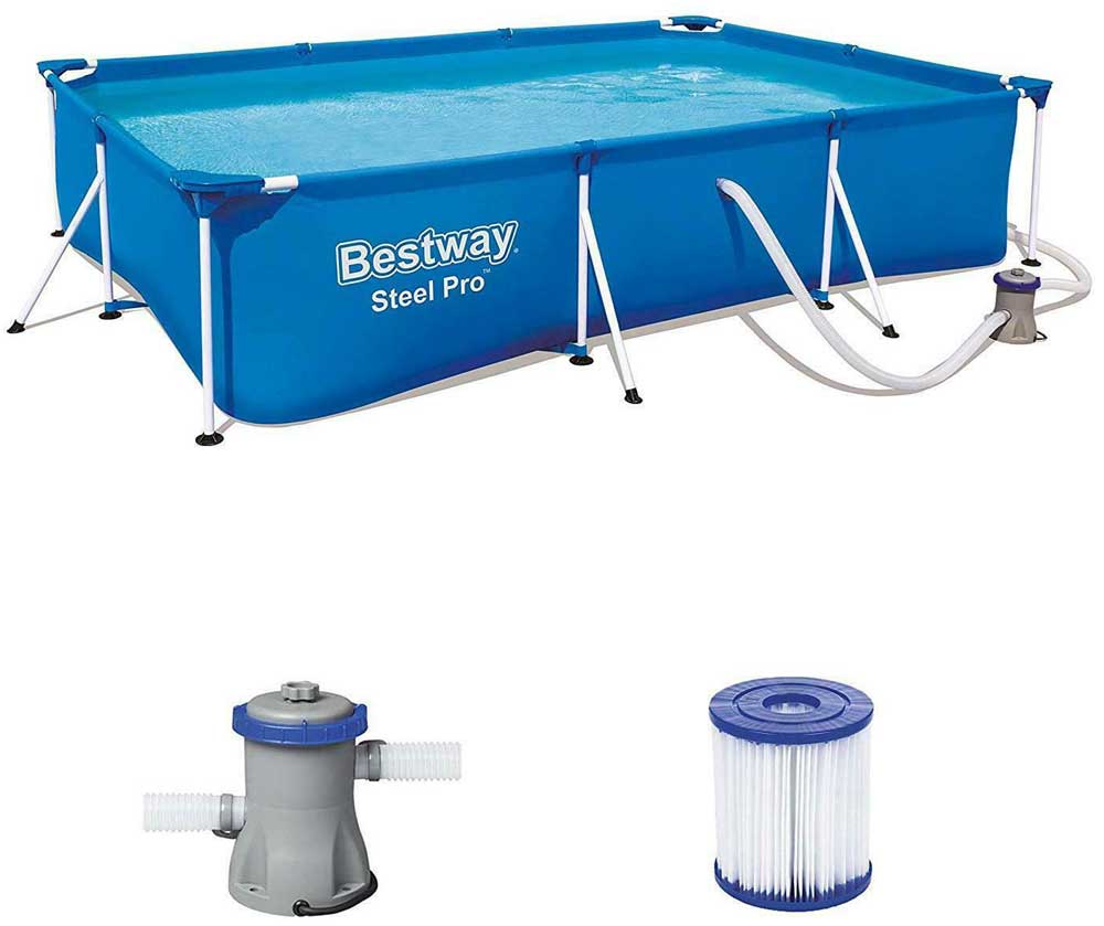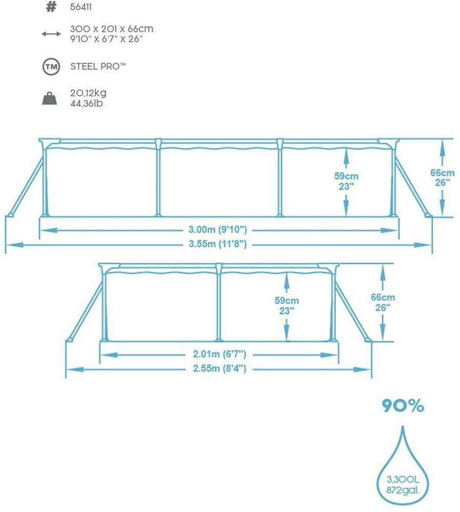 • Bestway. Diameter: 201 cm Length: 66 cm Capacity: 3300 L Rectangular Steel Frame Pro FlowclearTM has a capacity of 1